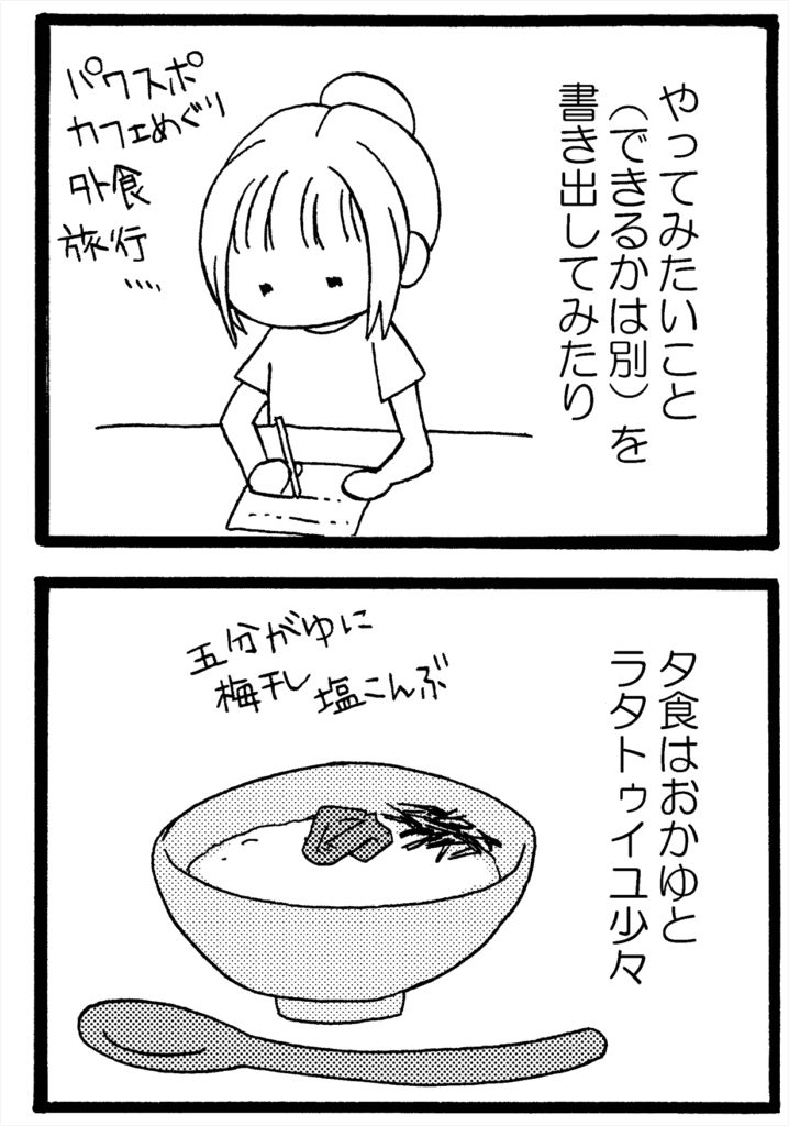 本当に具合悪いときって、朝は起きてから十分時間が経ってようやく、お椀半分の五分粥をいただく。トッピングの梅干しと塩昆布は味変のためではなく、少しでも栄養素を増やしたくて追加しました。