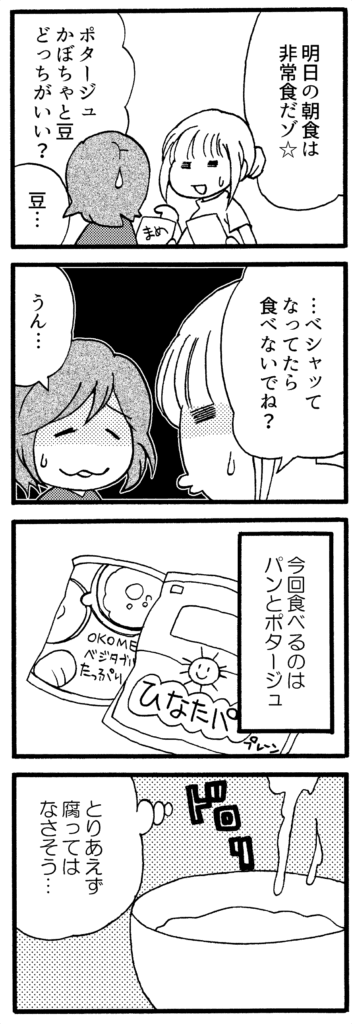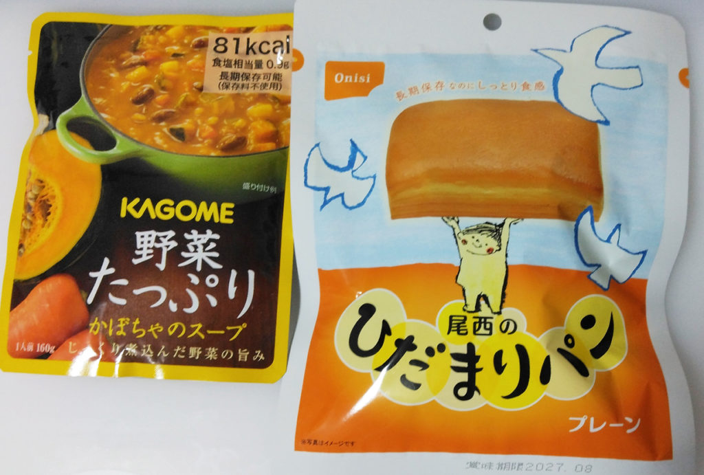 尾西食品さまの「ひだまりパン」プレーン味とカゴメさまの「野菜たっぷりスープ」かぼちゃのポタージュ。パッケージが日常感あって何やらおいしそうですね。普段の食事みたいで安心感があります。