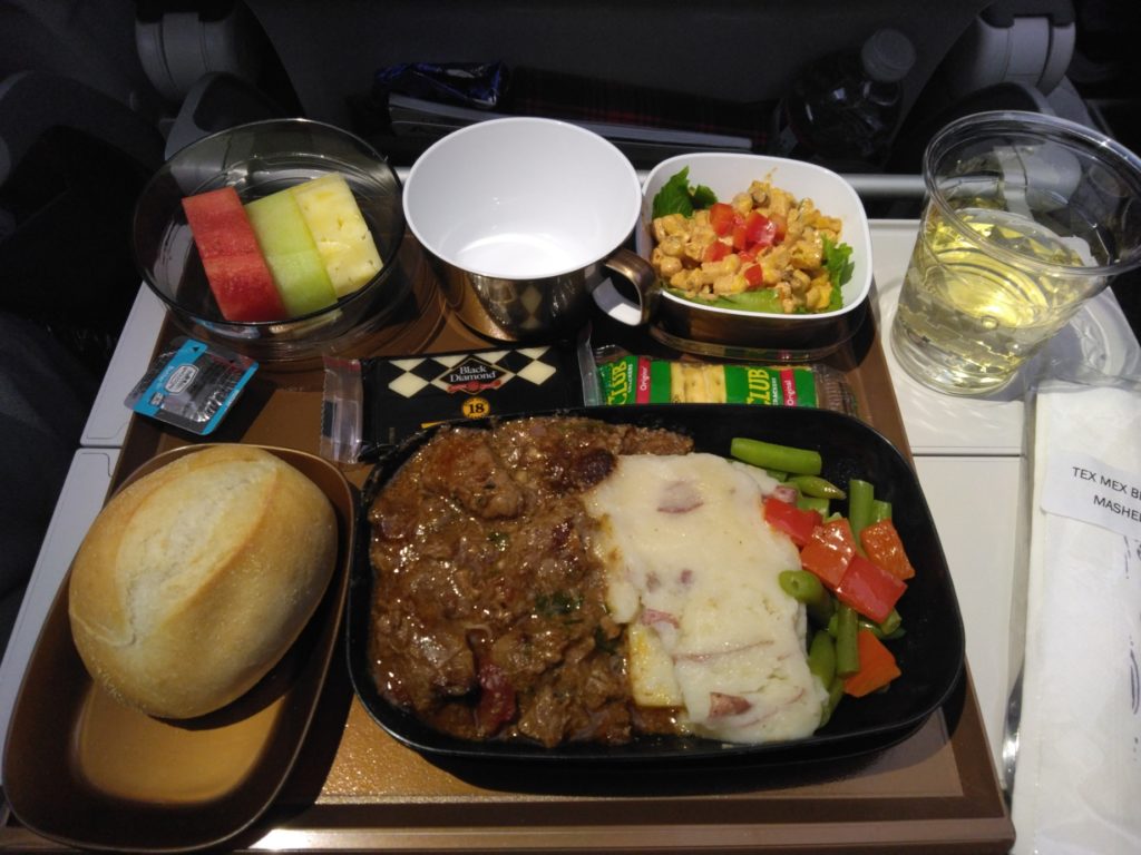 機内食一発目。提供されたのは夕方で、早めの夕食といったタイミング。時差に体を合わせるため、機内食と機内の照明で少しずつ「調整」されていきます。