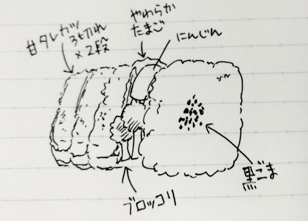 撮影し忘れたメインのうろ覚えイラスト。ブロッコリーはなかった気もする。お米がしっとりやわらかくて、夢中で食べてしまい写真無し。初手から不安ですが、まだまだこれから。