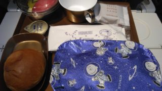 機内食は無理してまで食べる必要はないと思いますが、うぃろーは食べないほうが「もったいない」なあと気分が悪くなりそうで、ほぼ完食していました。提供される前にパンのいい匂いが漂ってきて、食べないという選択肢が無くて。ただ、機内食をしっかり食べてしまうと空港でごはんが食べられなくなるので、そちらが楽しみな方は調整するしかなさそうですね。